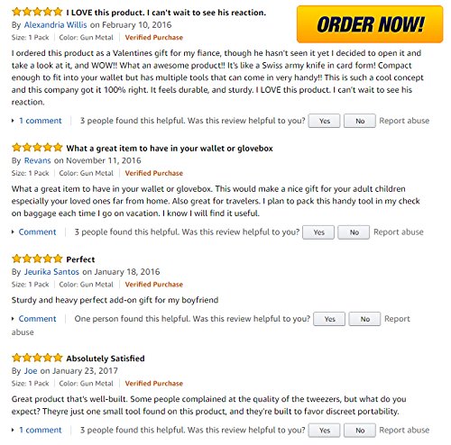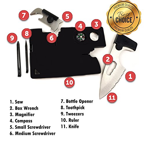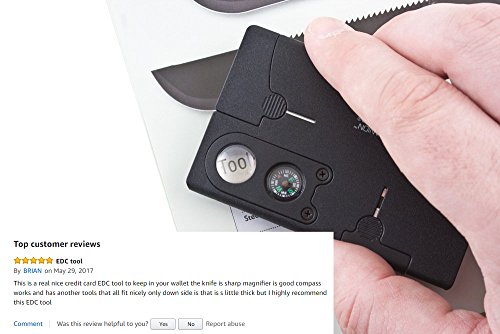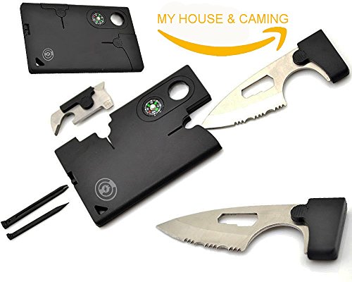 CREDIT CARD KNIFE of MY HOUSE CAMPING Item type: Multifunction tools Material: ABS, Steel Thickness: 6.6mm Product Dimension: 3.2*2.1*0.1in Weight: 46g Colour: Black Functions 11 in 1: Saw, Box wrench, Magnifier, Compass, Small screwdriver, Medium screwdriver, Bottle opener, Toothpick, Tweezers, Ruler, Knife. Package: 1x Multi-function tools 100% brand new and high quality Lightweight you can put in your pocket Perfect for camping, hiking, hunting, ect. Safety with the sheath It will be a handy thing to have around. It’s folded from credit card size to a functional pocket knife. This is a superlight and supersharp pocket knife with the size just like bank card. This is really convenient thanks to slimmer and lighter than ordinary knife. Moreover, the blade was made from stainless steel with no any toxic guarantee with the sharpness and the protective sheath preventing the injury or blunting. You will have the perfect tool ready in a pinch.The ultra sharp serrated knife will cut through just about anything, but it's compact and stows and locks into the tool's body.The toothpick and tweezers will get you a poke or a pinch in a pinch.The bottle and can opener with screw drivers will get you to those essential needed resources. CUSTOMER SATISFACTION IS OUR TOP PRIORITY We guarantee with high-quality materials for this credit card knife and manufacturing process to give you this premium credit card. So, we will give back 100% money guarantee in case you’re not satisfied with our product for your peace of mind. Add the Credit card knife to YOUR CART Now! 0 |