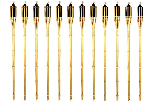 Bamboo Tiki Torches - 12 Pack - Metal Oil Canister - Reinforced With Metal Ring - 5 ft High, 20oz. Capacity - Sharp Speared Bottom By Kaya Collection