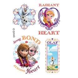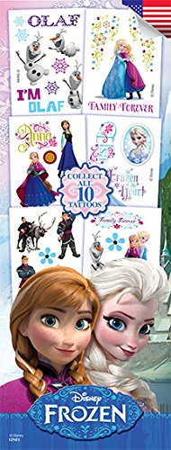 -. Feature : Complete set of ten 2.5" by 3.5 inch Disney Frozen tattoo sheets / Anna, Elsa, Olaf, Kristoff, Sven / Application instructions on the back of each sheet. Tattoos are non-toxic, hypoallergenic, and use FDA certified colorants / Multiple tattoos on each sheet. Comes packaged in a plastic bag / Officially Licensed Disney product