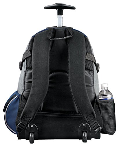 Product Description 600 denier polyester with ripstop accents and rubber bottomTwo large front pockets side pockets and mesh water bottle holderOne-hand push button pulley system for easy use and stowageHandle extends to 18.5 Smooth durable inline skate wheelsBackpacks not intended for use by children 12 and under.Dimensions (Inches) :20.5 H x 13 W x 7.9 D 0