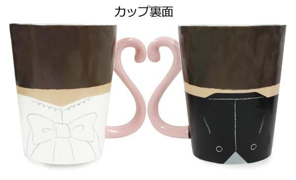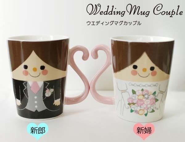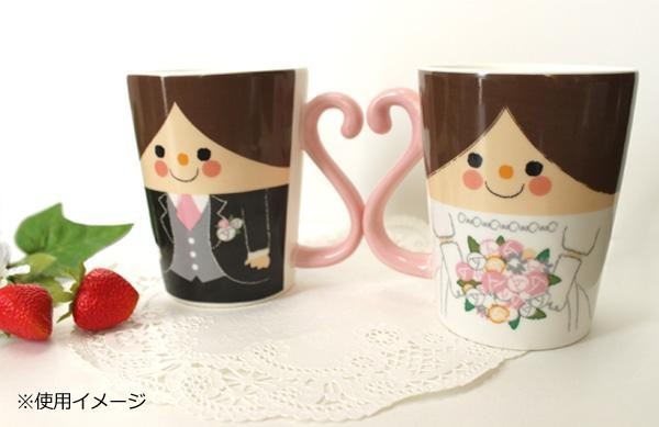 可愛い新郎新婦のマグカップ♪幸せいっぱいの2人を合わせると取っ手がハートの形に!!