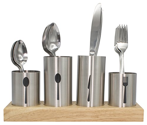SLEEK DESIGN — Beautifully complements appliances, cabinets, countertops, and most kitchen décor — Features 4 round compartments of various heights for knives, spoons, and forks —Service for 12 with room to spare — Each holder is removable from base and can be placed in different slots —Made of stainless steel with bamboo wood base — Easy to clean with damp cloth — (Round opening measures approximately 2.5”) Entire Unit Measures approximately 11.75”L x 3.37”W x 5.50”H
