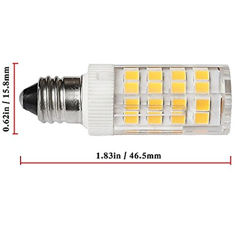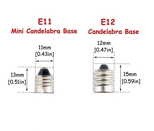 - ♣.E11 Mini Candelabra base (diameter of base is 11mm/0.43in, length of base is 13mm/0.51in ) is a little smaller than an E12 candelabra base (diameter of base is 12mm/0.47in, length of base is 15mm/0.59in). Check the left photos. Make sure you order the right product.