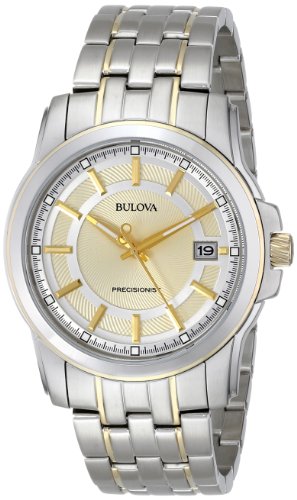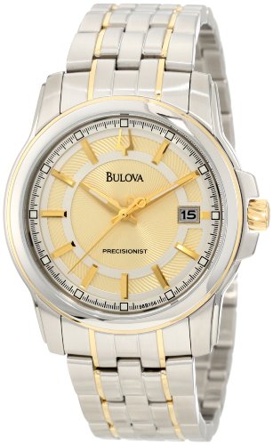 -. Binding : Watch -. Brand : Bulova -. Color : gold -. Department : mens -. EAN : 0042429489653 -. Feature : Due to a recent redesign by Bulova, recently manufactured Bulova watches, including all watches sold and shipped by Amazon, will not feature the Bulova tuning fork logo on the watch face. / Precisionist, one of the world's most accurate movements - accurate to within seconds a year / Stainless steel case and bracelet in two-tone silver and gold finish / Continuously sweeping second hand / Water resistant to 30 meters -. Label : Bulova -. Manufacturer : Bulova -. Model : 98B156 -. MPN : 98B156 -. PackageQuantity : 1 -. PartNumber : 98B156 -. ProductGroup : Watch -. ProductTypeName : WATCH -. Publisher : Bulova -. ReleaseDate : 2012-01-16 -. Studio : Bulova -. Title : Bulova Men's 98B156 Precisionist Champagne dial Watch -. UPC : 042429489653