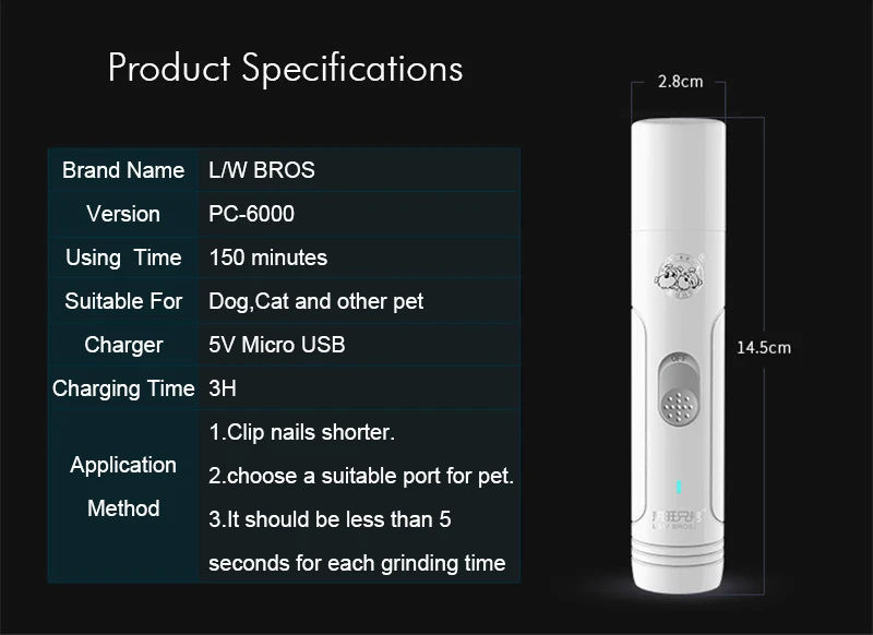 Type:Dogs Item Type:Nailclippers Brand Name:L&W BROS Material:Diamond grinding wheel Version:PC-6000 Using time:150 minutes Suitable for:dog,cat and other pet Charger:5V/ Micro USB Charging time:3H Material:Diamond grinding wheel/ABS Model NO:2000014422