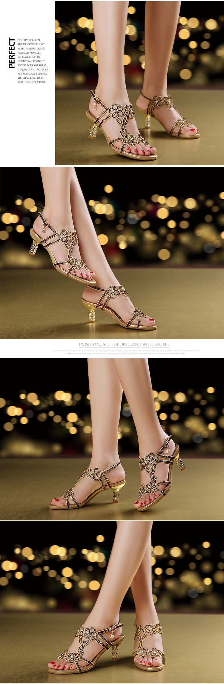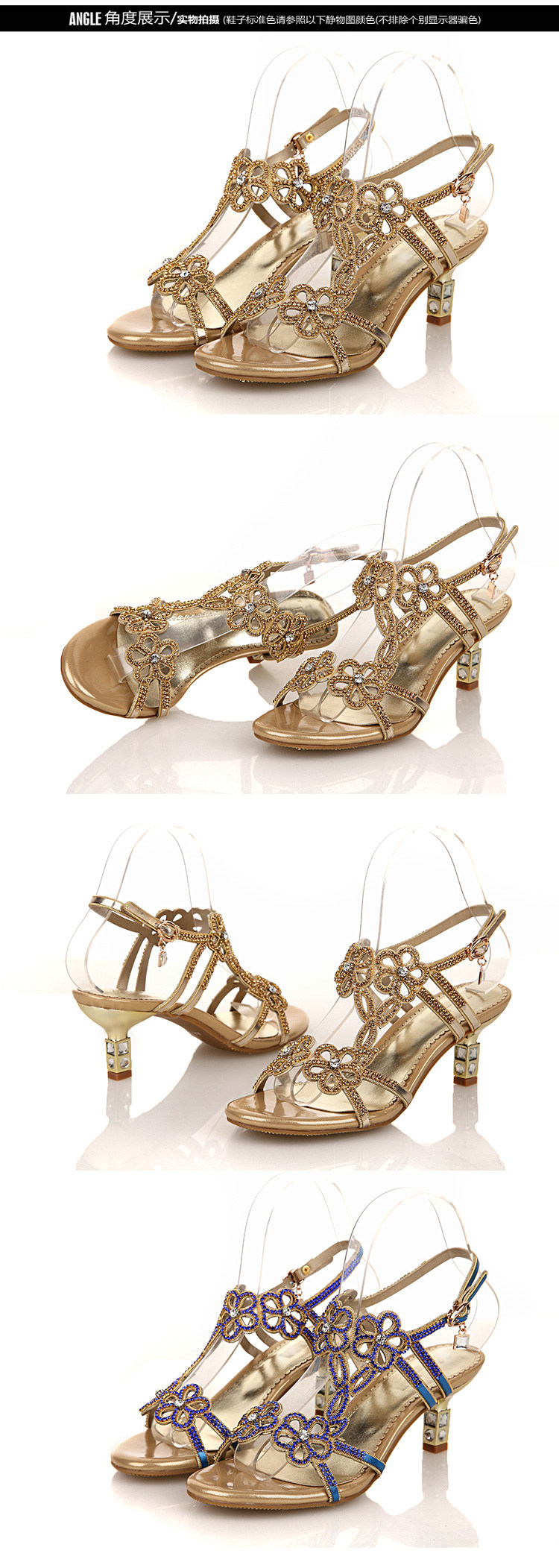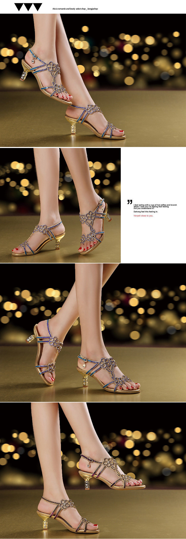 夏细跟中跟水钻凉鞋女性感镂空镶钻水晶凉鞋高跟露趾鱼嘴凉鞋