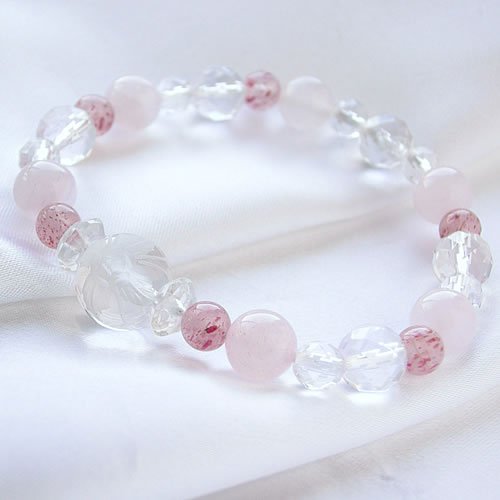 -. Feature : ◆薔薇水晶の球の大きさ:12ミリ◆ストロベリークォーツの球の大きさ:6ミリ / ◆ローズクォーツの球の大きさ:8ミリ◆ブレスレットの長さ:16センチ(女性Mサイズ) / 《ストロベリークォーツ》最高のお守り石のひとつと言われているストロベリークォーツ。恋愛のお守り石・人間関係を円滑にし、他人の欠点に寛大になる・ネガティブな感情をを寄せ付けない・美しさを高め、若さを保つなどのパワーを持つと言われています。 / 《ローズクォーツ》恋愛成就のパワーストーン、ローズクォーツは、心に満足感と平和を得ることが出来るストーンとも言われています。ローズクォーツのストーンを持っていると優しいエネルギーが流れいつでも癒しのひと時を与えてくれそうです。 / 薔薇の手掘り水晶付きのお守り石・・・ストロベリークォーツとローズクォーツのブレスレットです。淡い色合いでピンク系のパワーストーンを組み合わせました!透明感のあるカラーは女性におすすめのブレスレットです。
