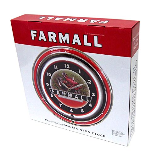International Harvester McCormick Farmall 15 Inch Double Neon Wall Clock - Double neon McCormick Farmall wall clock looks great with any décor! With its red-and-black color theme, it dresses up any room you put it in. This 15" round clock has a chrome outer housing, small IH logo beneath the central Farmall logo, a red neon outer ring and white neon inner ring. Clock uses one AA battery (not included). Neon lights plug into the wall (AC adapter included).Feature