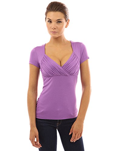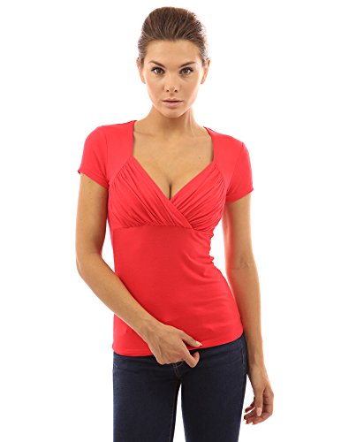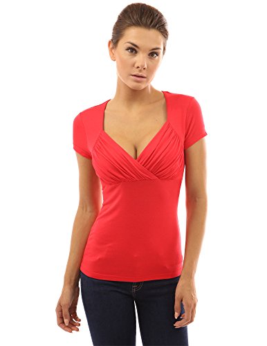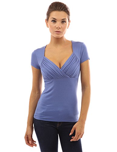 PattyBoutik V Neck Pleated Empire Waist Short Sleeve Solid Stretch Blouse Top. Model in pictures is 5 feet 8 inches (173cm) tall.