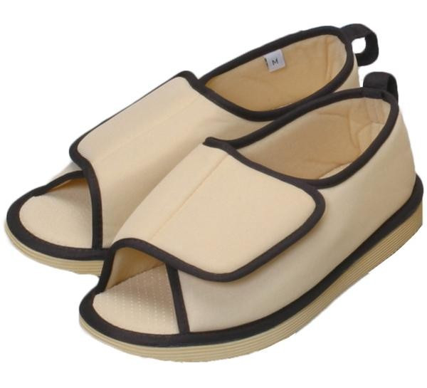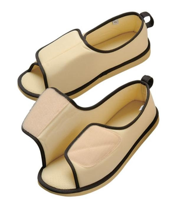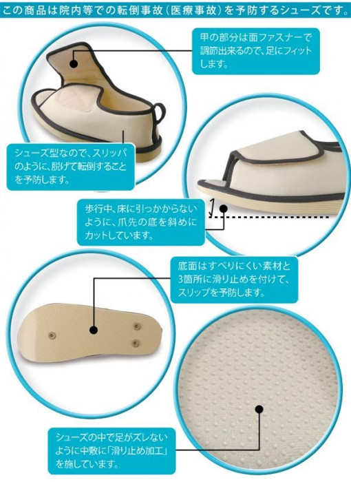| シューズ型なので、スリッパのように脱げて転倒することを予防します。甲の部分は面ファスナーで調節出来るので、足にフィット。底面はすべりにくい素材と3箇所に滑り止めを付けて、スリップを予防します。歩行中、床に引っかからないように爪先の底を斜めにカットしています。 |