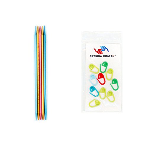 addi FlipStix Double Pointed Aluminum 6-inch (20cm) Knitting Needles (Set of 5) Size US 07 (4.50 mm) with 10 Artsiga Crafts Stitch Markers