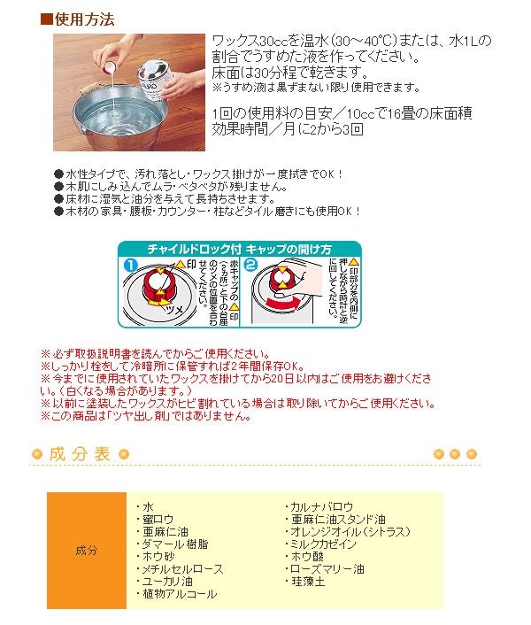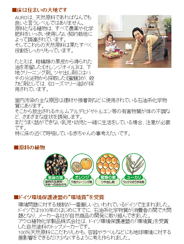 環境問題に関心の高いドイツで生まれた100%天然原料にこだわったフロアー用ワックス!農薬や化学肥料を使用しないで育った 植物から作られたので人にも環境にもやさしい♪