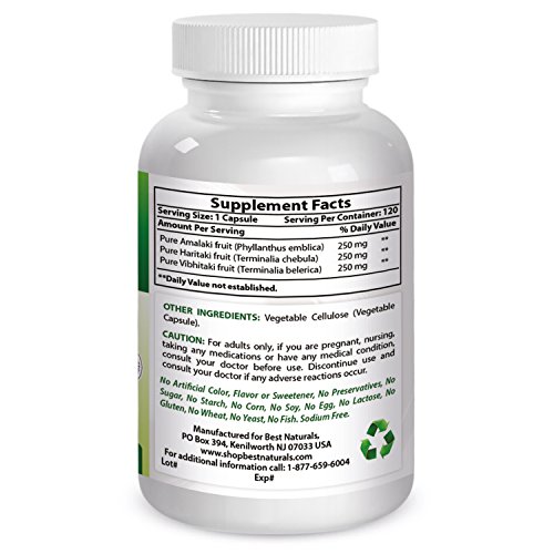 -. Binding : Health and Beauty -. Brand : Best Naturals -. EAN : 0817716011332 -. Feature : Ayurvedic Digestive Cleanser / The Only Product Contains 750 mg of Triphala / Made with Natural Herb / Safe for Vegans and Vegetarians / All Best Naturals products are manufactured in accordance with Good Manufacturing Practices (GMP), among the highest standards in the world -- Proudly Made in USA -- Purity & Potency Guaranteed -. IsAdultProduct : 0 -. Label : Best Naturals -. Manufacturer : Best Naturals -. Model : 817716011332 -. MPN : 817716011332 -. PackageQuantity : 1 -. PartNumber : 817716011332 -. ProductGroup : Health and Beauty -. ProductTypeName : HEALTH_PERSONAL_CARE -. Publisher : Best Naturals -. Studio : Best Naturals -. Title : Best Naturals Triphala 750 mg 120 Vcaps -. UPC : 817716011332