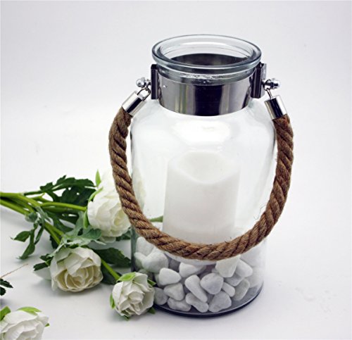 -. Feature : ❤ QUALITY MATERIALS: Made from durable clear glass, stainless steel loop tightly fixed on the top of the lantern with a sturdy jute rope handle. This ensures that they will last in tiptop condition for years to come. Easy to pick and carry. ★Set of 1★ / ❤ DECORATIVE LED CANDLE AND STONES INCLUDED : The LED candle and a bag of white stones are included in the set for an instant decoration. You don't need to buy them especially. You could also put some sand in it to have a beach and sunshine feeling. / ❤ MODERATE SIZE: This lantern measures 5.7"L X 5.7"W X 10"H, and can hold regular pillar candle and LED candle. / ❤ FOR WEDDING CELEBRATION & PARTY & SPECIAL OCCASIONS: Absolutely beautiful and vintage way to add romance and unique if you want a wonderful wedding on the beach. A perfect choice for hanging on occasions where the light must be elevated or outdoor wedding. Decorate your tabletop beautifully and affordably for party and special occasions. / ❤ FOR HOME DECOR AND GIFT GIVING: Not only for your wedding, party and special occasions, but for your home afterward - a timeless and stunning addition to any decor! You can also make it a charming and useful gift! ★For decoration ONLY! ★