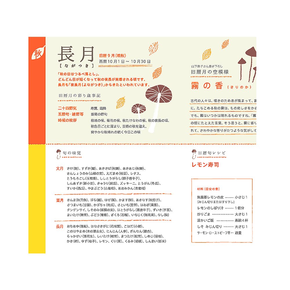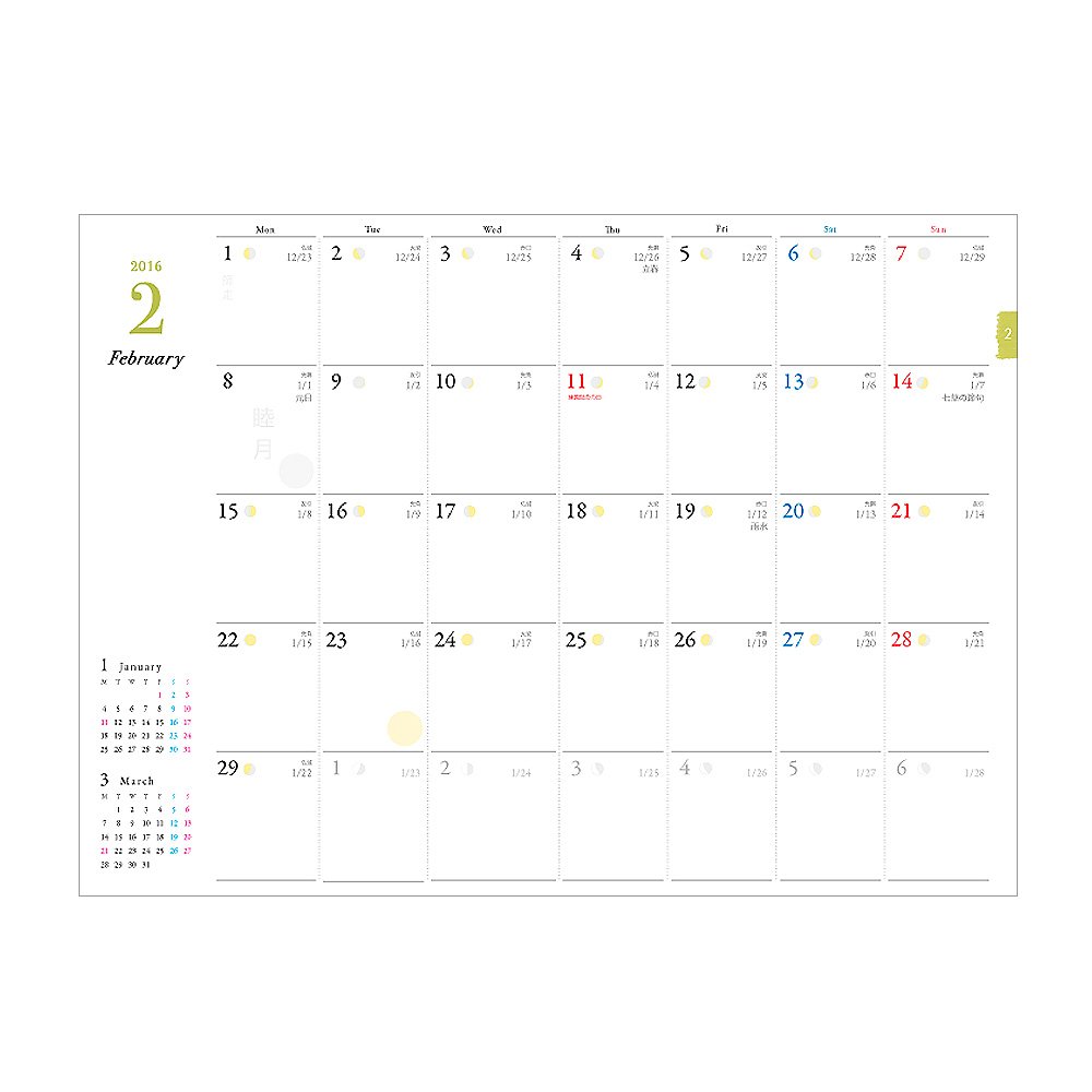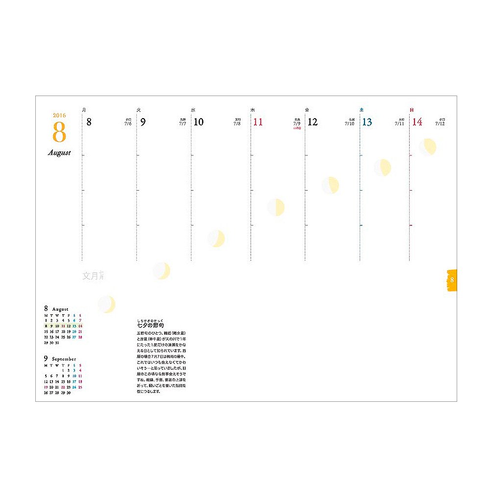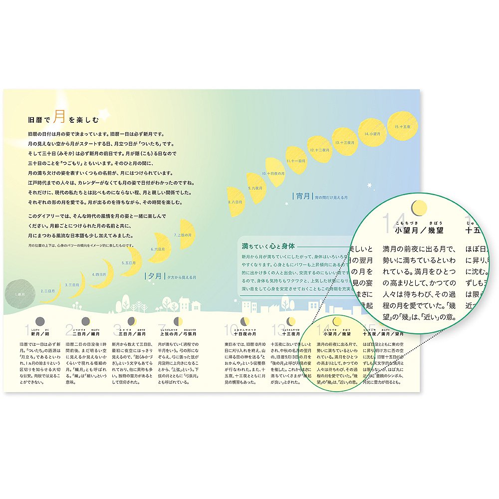 It is a notebook of "separate goods" which can not be compared with others, by adding moon phases, wisdom of the lunar calendar, columns of physical sensation to the functions of the Christian calendar, and users themselves can nurture a "body view".
