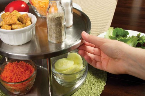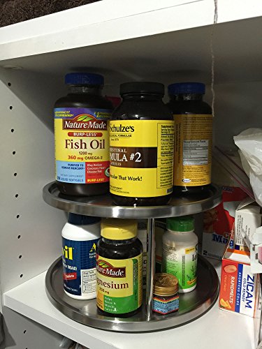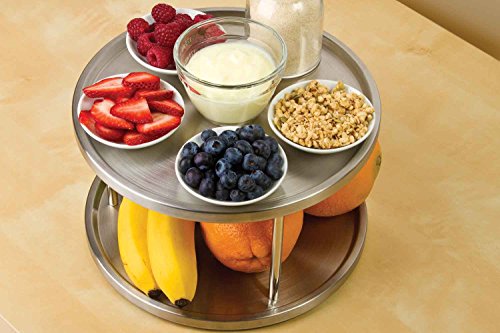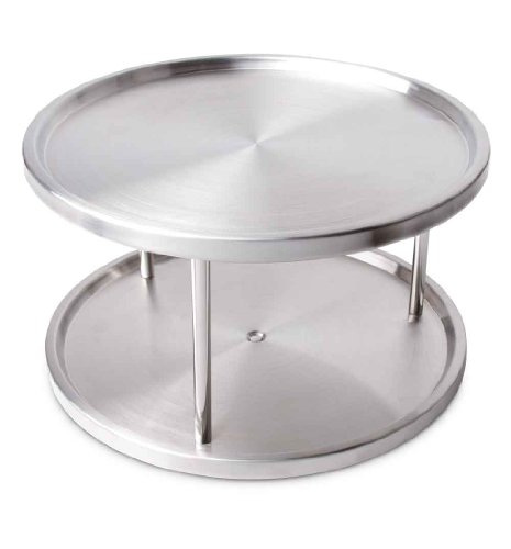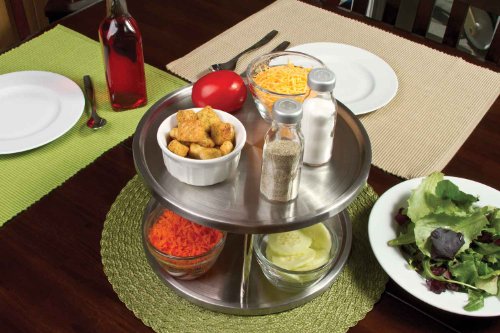 BEVELED SAFETY EDGE HELPS PREVENT ITEMS FROM SLIDING OFF. The two shelves of the 2 tier tabletop lazy susan turntable have a beveled edge that helps to prevent items from sliding off the lazy susan spice rack turn table. Perfect for organizing, storing and serving spices, condiments, napkins spices, food, candies and more at the kitchen table, or kitchen counter tops and even cabinets. SMOOTH BALL-BEARING ACTION ROTATES WITH JUST A TOUCH AND MAKE IT EASY TO USE. Revolving spice rack design open sides from all around, allows for easy reach and access or spices, condiments and other essentials when used as a tabletop turntable on a dinner table, or kitchen counters and kitchen cabinets. 2 TIER SRONG STAINLESS STEEL METAL CONSTRUCTION compliments and blends with any kitchen and home decor. 2 Tier design allows to store twice the number of items. The gap of 5.25" between the bottom tier and top tier make it perfect to store small spice bottles, sauce cups other shorter items on the bottom shelf and taller items on the top shelf. KEEP YOUR DINNER TABLE, KITCHEN COUNTERS AND CABINETS CLEANER AND ORGANIZED. Compact size 10" in diameter make it ideas to be placed on top of a dinner table, kitchen counter, or even kitchen cabinet without it taking up too much of a space. PERFECT LIFE IDEAS COMMITMENT: At Perfect Life Ideas we are committed to providing you with innovative solutions to modern living. If you ever have questions or comments regarding our products we would be glad to hear from you. WE GUARANTEE IT! We want you to be satisfied with our products, so you can buy with confidence! Scroll to the top and click the ADD TO CART button to order Now! 0 |