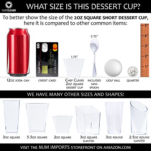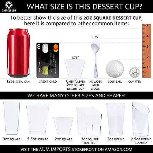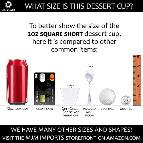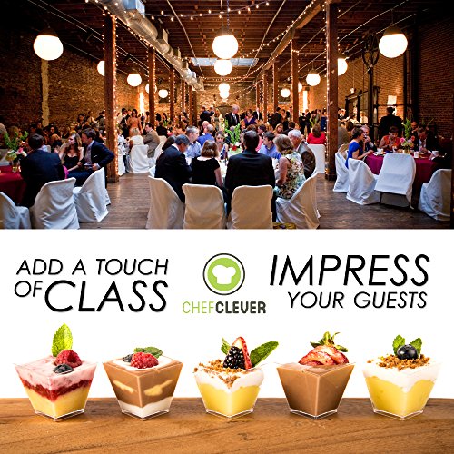 YOUR SEARCH FOR THE PERFECT DESSERT CUPS IS FINALLY OVER! When you buy the 50 count set of Chef Clever's 2oz Serving Cups today, here's what you should do... As soon as the little brown Amazon box arrives, rip it open the first chance you get! Take out the clear bag from the box, and marvel at the cubed little extras that will make your next party a big hit... YOU'LL HAVE IN YOUR HANDS THE BEST 2 OZ PLASTIC DESSERT CUPS ON THE MARKET TODAY! Take them out of the bag, set them out on the counter and fill them with favorite appetizers, bite-sized hors d'oeuvres, mousses, fruit desserts and any other small snack you want to serve at your next event. ADD A TOUCH OF CLASS BY MAKING CHEF CLEVER'S 2 OZ DESSERT CUPS A PART OF YOUR KITCHEN GEAR: ? showcase up to 50 culinary creations to impress your guests ? either dispose of or wash and re-use the cups should you want to ? create a beautiful presentation for your next tasting party ? appreciate the premium crystal clear plastic and superior modern styling of these serving cups ? see why Chef Clever's cups are the gold standard for caterers Should inspiration strike, whether it's at wedding, a banquet or a house party, remember to to stock up with a few packs of elegant dessert cups to make sure you have an unforgettable night! 0 |