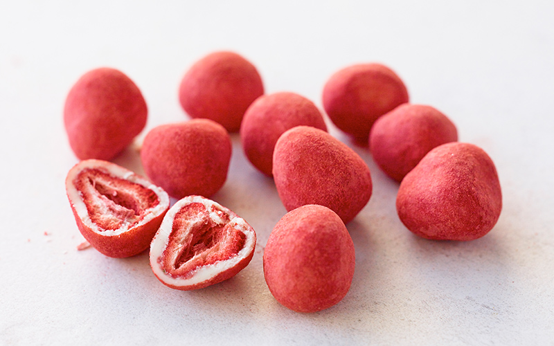フリーズドライの楽しい食感にくわえ、甘酸っぱい苺パウダーの酸味と