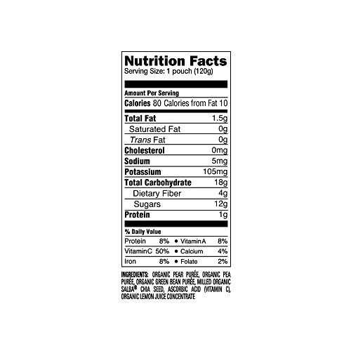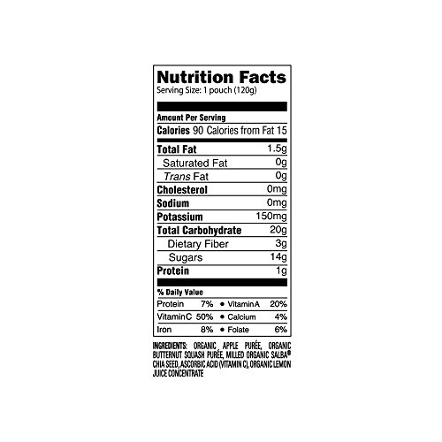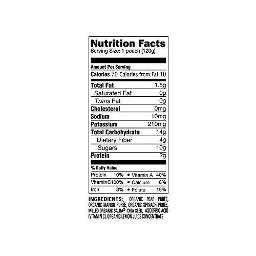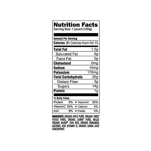 Organic fruit and veggie mixes with Salba the SUPER Chia for added nutrition ("green beans, pear & pea","sweet potato, apple, carrot & cinnamon","apple and butternut squash" and "spinach, mango, pear")
