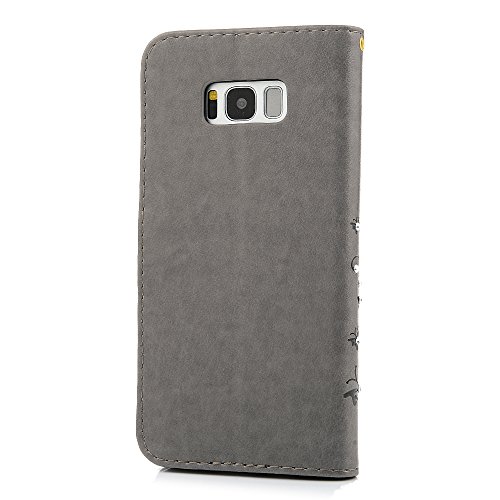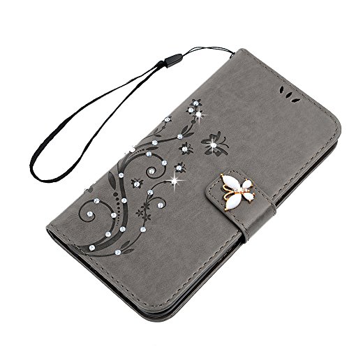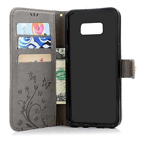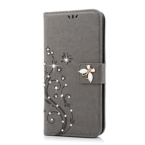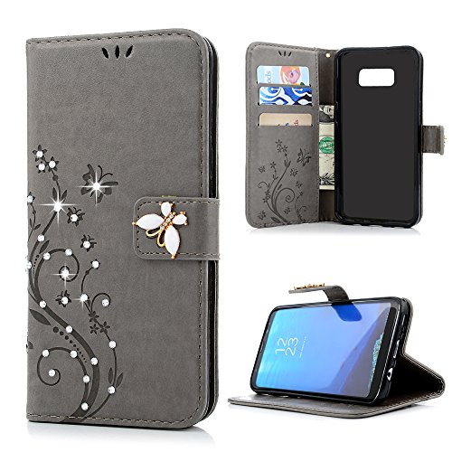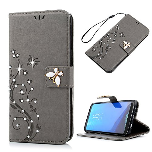 Galaxy S8 Plus Case, YOKIRIN Luxury 3D Handmade Bling Crystal Rhinestone Embossed Floral Butterfly PU Leather with Wrist Strap Stand Credit Card ID Holders Wallet Cover & Dust Plug, Stylus Pen,Gray