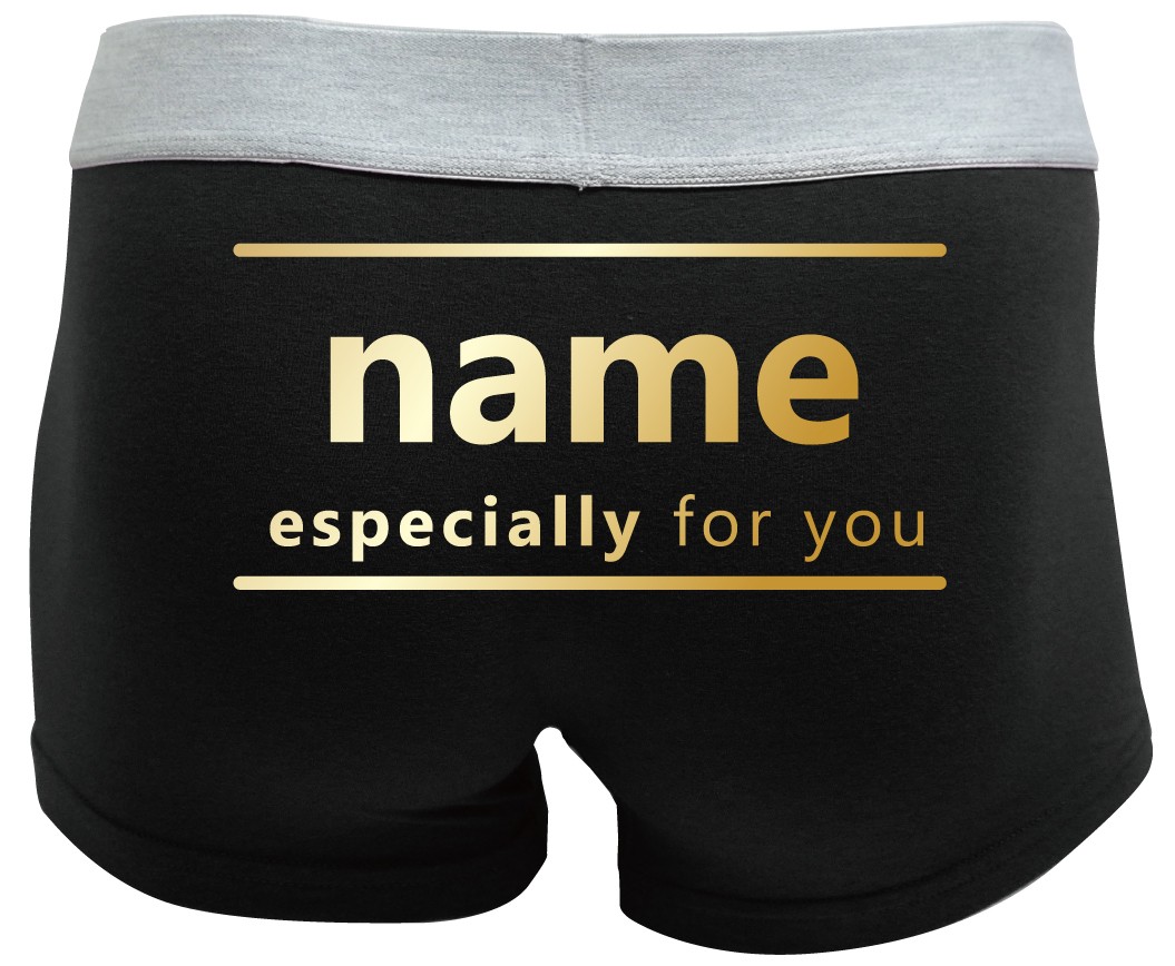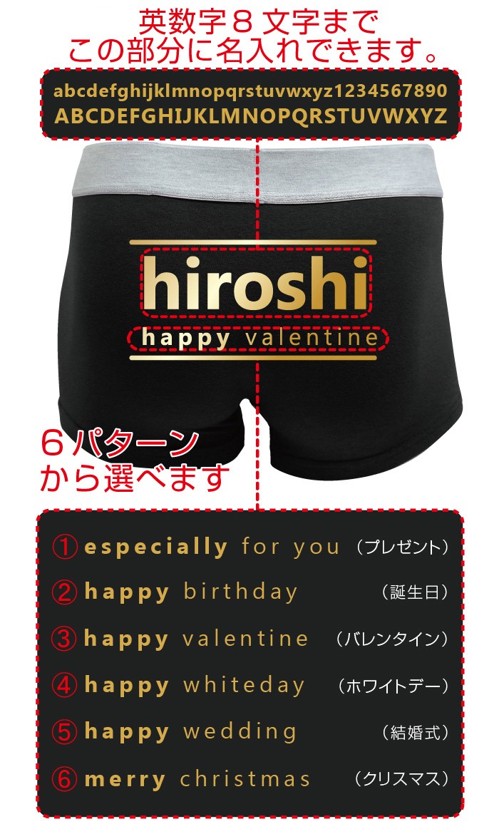 黒色ボクサーパンツのヒップに豪華金文字でチョコレートのパッケージのように名入れします。 文字はアルファベット小文字のみ6文字まで金色でプリントします。アルファベット以外の文字を入れた場合は自動的にキャンセルとなりますので、ご了承ください。※特殊文字および記号は不可となります。 1~3までのメッセージが選択できます。1:especially for you2:happy birthday3:happy valentine4:hhappy white day検索対象 義理 本命 おもしろチョコ 風 パンツ 名前入れ