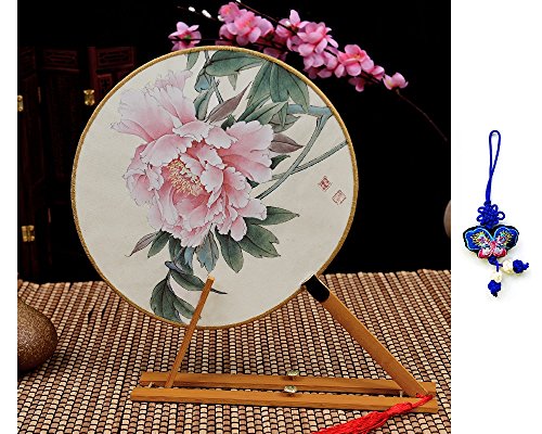 ZHAMS Bamboo Silk Handle Round Hand Fan,Chinese Tang Dynasty Style with Butterfly Embroidery Pendant (C)