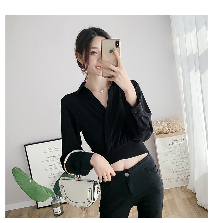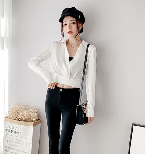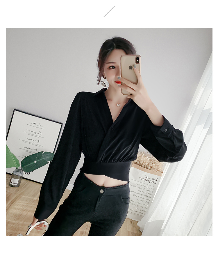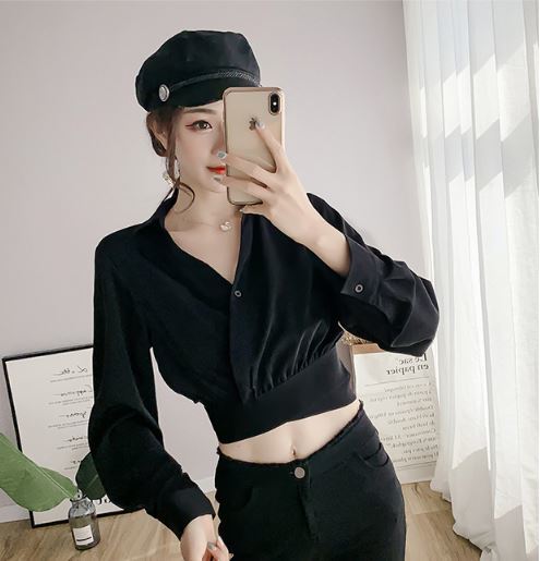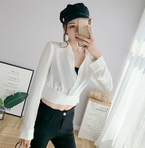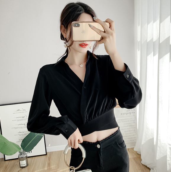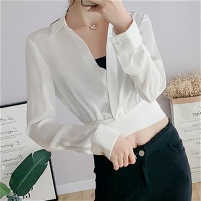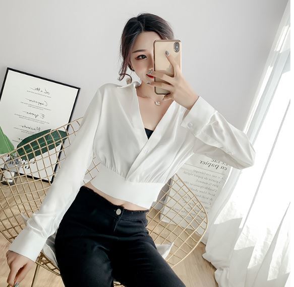 大きく開いたVネックとへそ出しデザインがセクシーな長袖シャツです。