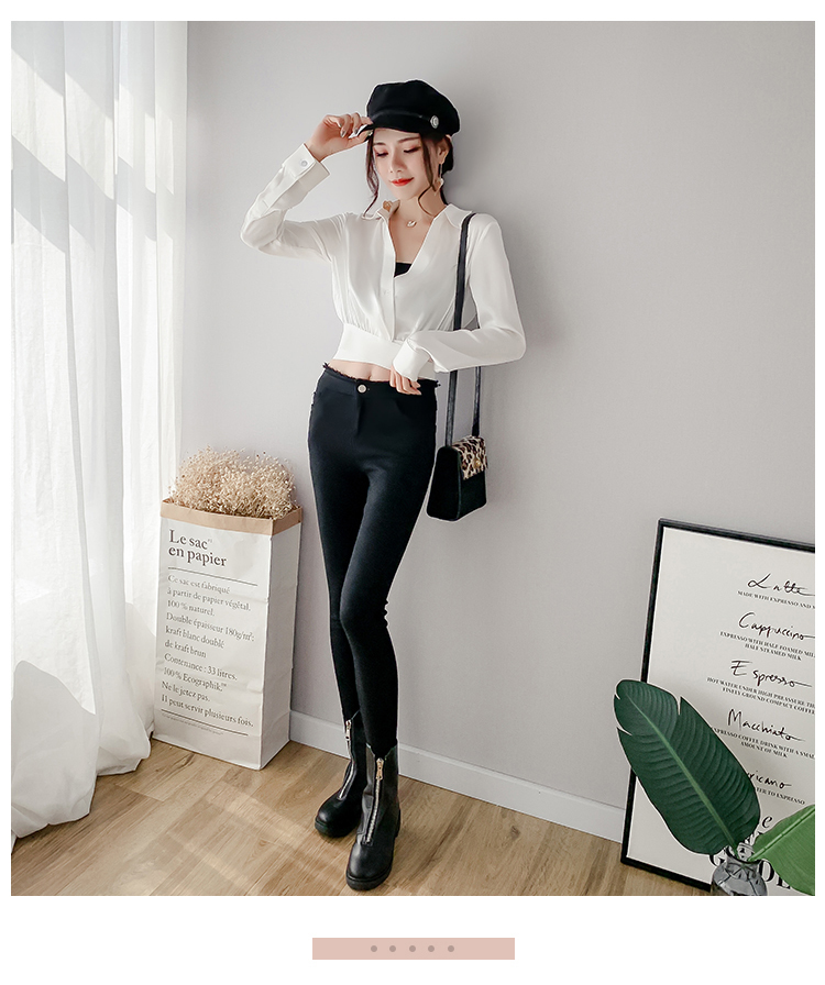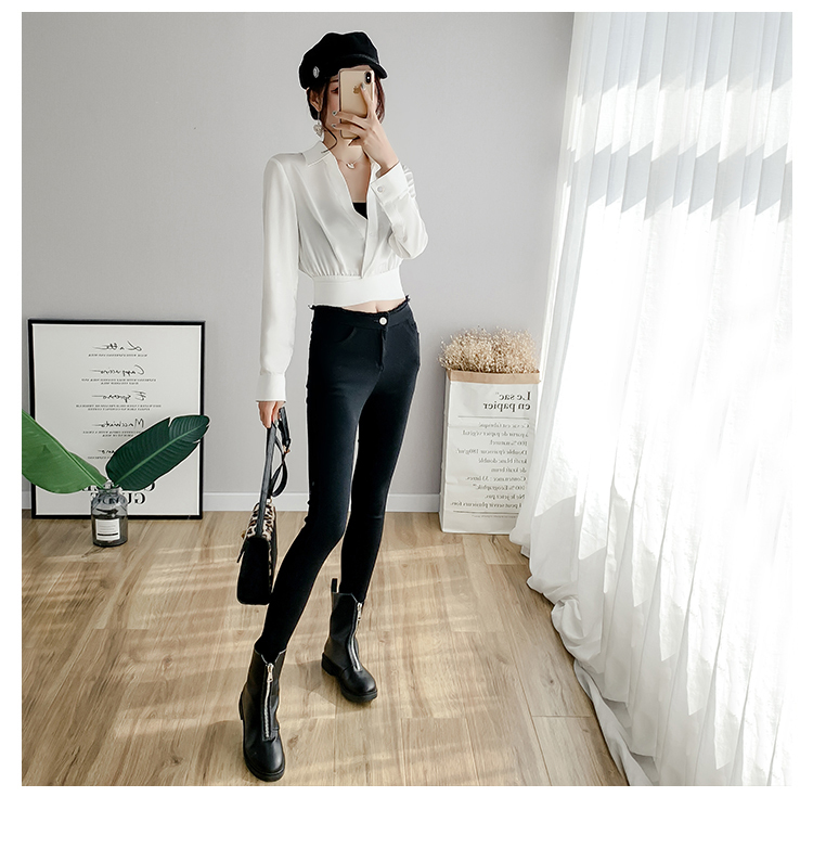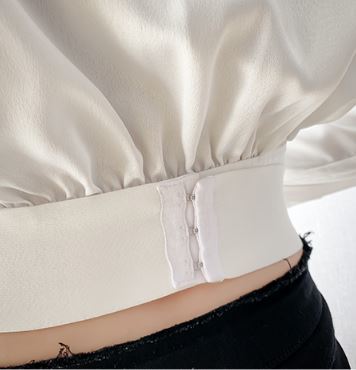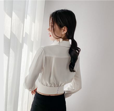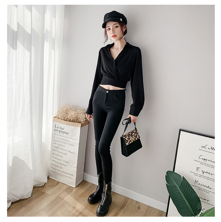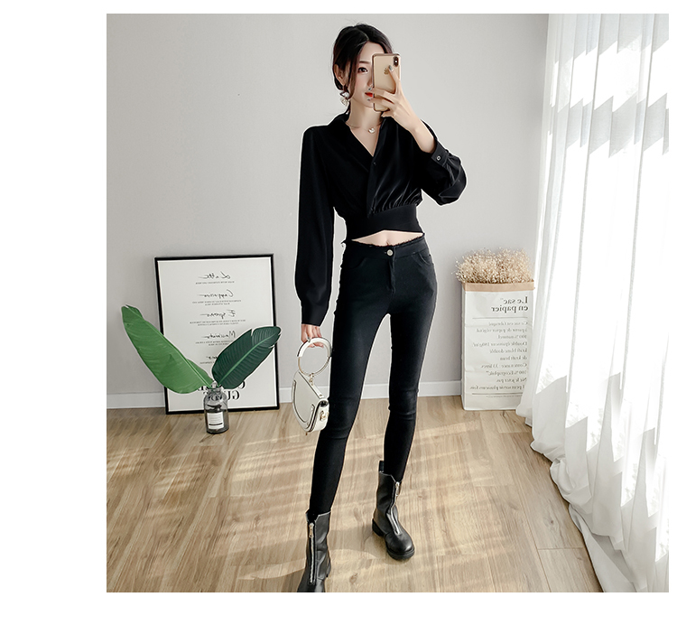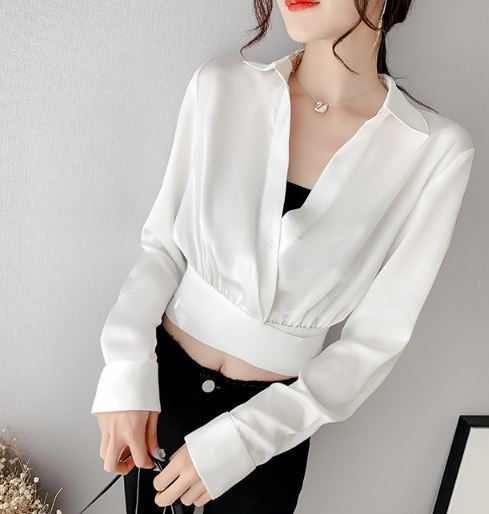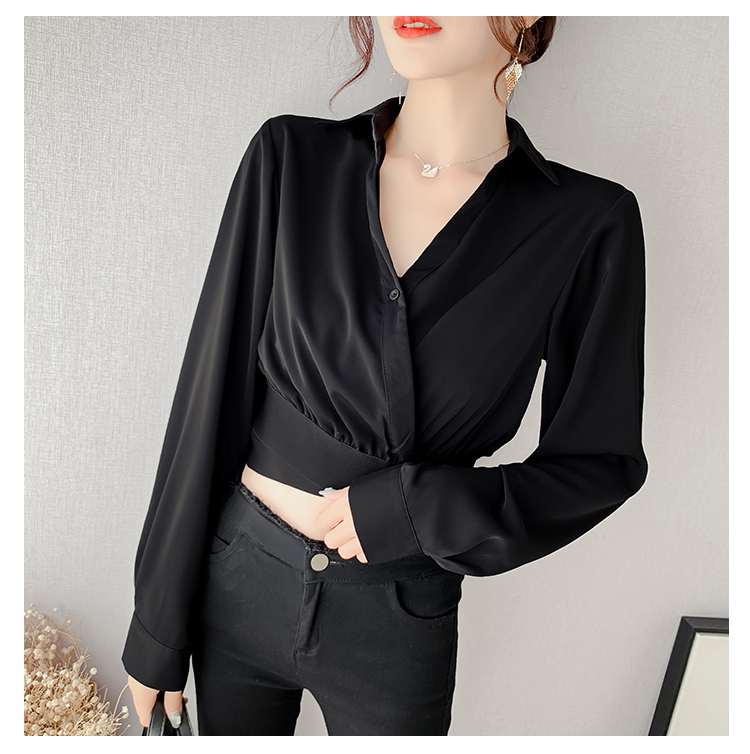 大きく開いたVネックとへそ出しデザインがセクシーな長袖シャツです。