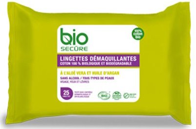 Bio Secure 100% Organic Cotton Make-Up Remover Wipes for All Face Types With Aloe Vera and Oil of Argan - 25 Cotton Wipes. 97.92 % of the total ingredients are of natural origin 20.99 % of total ingredients are from organic farming
