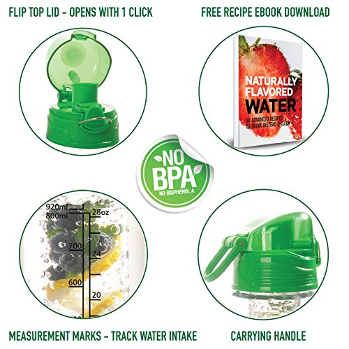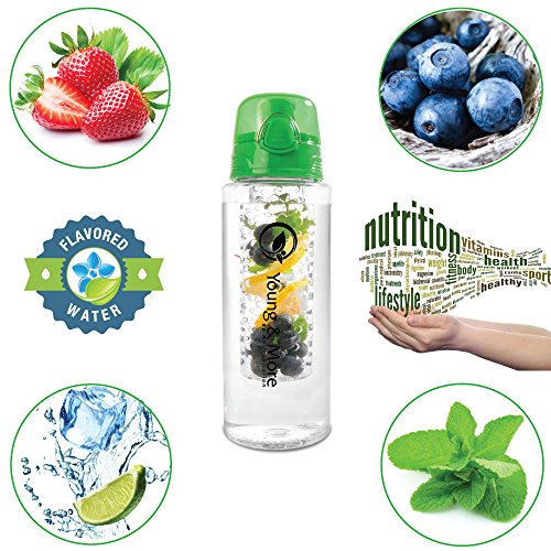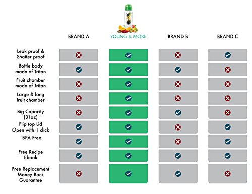 **BEWARE OF COUNTERFEITERS. Genuine Young & More brand products are fulfilled by Amazon & only from Amazon.com** Tired of drinking bland-tasting water day after day? Want to add a little "zest" to your typical beverages? Well, if so, our infused water bottle is perfect for you! This water infuser allows you to easily add fruit or another flavor source to your beverage to create new taste sensations that you will love to drink. For example, just fill this infused water bottle with liquid and then add fruit slices to the water infuser cage, shake well and drink! You'll love the taste and you'll love the potential health benefits that come with adding fruit to water! This infused water bottle is great for use at the gym or when traveling or just at home. It's also great for detox and weight loss programs and can help ensure you are getting essential vitamins and minerals from fruit. Check out what these great benefits: EASY-TO-USE - Everything from the flip-top spout to the removable water infuser cage to the strainer make this infused water bottle easy to use and highly effective! CREATE TASTY, HEALTHY BEVERAGES - Just fill this infused water bottle with liquid and then add fruit or another flavor source, shake well and drink! You'll love the taste and you'll love the potential health benefits that come with adding fruits to water! SAFE - This infused water bottle is BPA-Free! It is also dishwasher safe and easy to clean! FREE BONUS - Order today and receive a Free Ebook! Get your infused water bottle today. Just click the add to cart button above.Feature