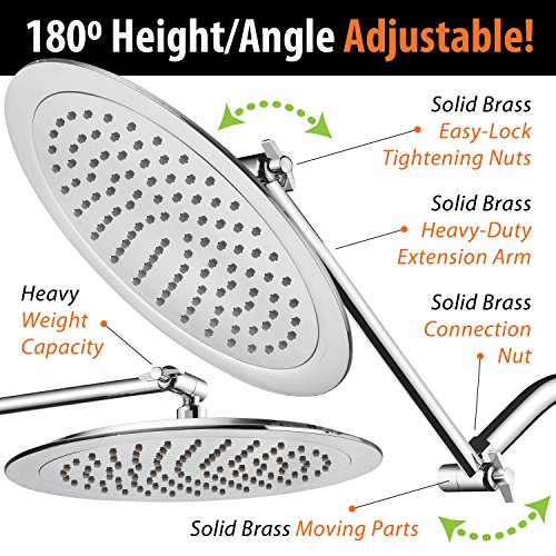 SHOWER ARM: Solid Brass Heavy Duty Extension Arm. 180 Degrees Height & Angle Adjustable. Fits ANY Shower Head or Hand Shower. 2-foot Vertical Movement Range. Solid Brass Easy Lock Tightening Nuts, Moving Parts and Connection Nut. Heavy Weight Capacity.