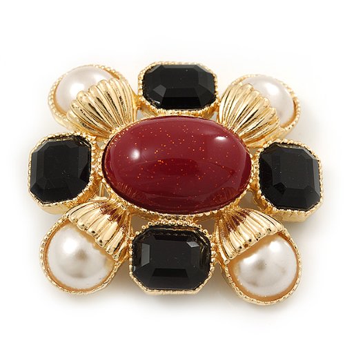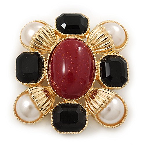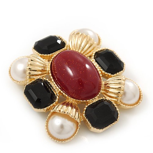 -. Title : Square Simulated Pearl, Black Glass, Red Stone Brooch In Gold Plating - 5cm Length