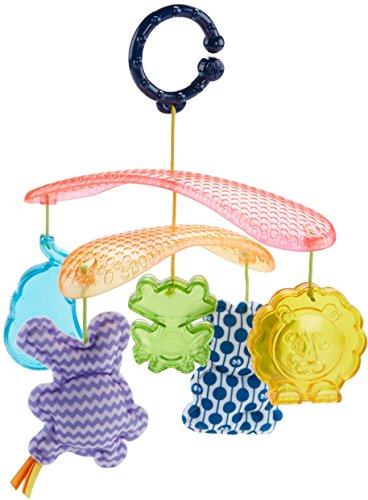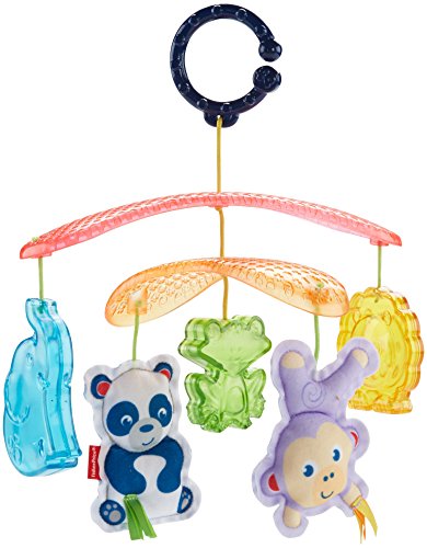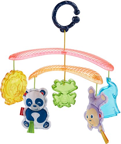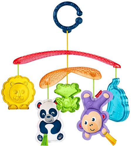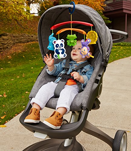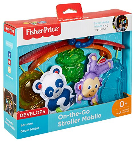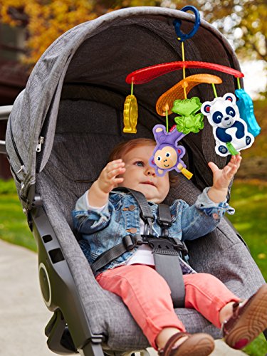 Every trip in the stroller becomes an exciting adventure with the On-the-Go Stroller Mobile from Fisher-Price. Five friendly animal toys dangle overhead, facing little ones and encouraging them to reach for and bat at their colorful pals. As the sun shines through the modern mobile arms, its bright light can sparkle on the translucent elephant, froggy and lion toys, catching your baby's eye. Oh, hey guys. Closest to your baby's reach are the soft panda with a rattle and monkey that jingles, with fun, textured fabrics for tiny hands to grab and explore. When you've got places to go, simply attach the mobile to the stroller canopy with the convenient link and you and your tiny explorer are ready to roll. Where development comes into play Sensory: Bright colors, patterns, friendly animal faces and the gentle movement of the mobile stimulates your baby's visual senses. Gross Motor: The overhead mobile encourages little ones to reach for and bat at the toys, helping to strengthen developing gross motor skills.Feature
