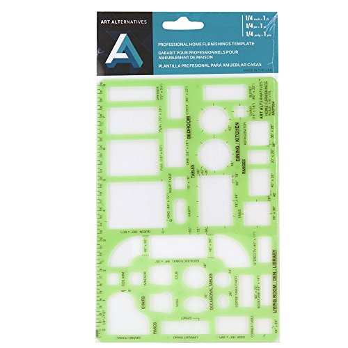 Redesigned Art Alternatives templates are made from durable and flexible 0.03" transparent green plastic with a matte finish on one side to reduce glare and ease eye strain. The professional Home Furnishings 1/4" template aids in interior design and placement of common furniture pieces. Scale is 1/4" = 1 foot, making layouts easy for home staging, pre-move planning, and rearranging prior to any heavy lifting. Centering lines provide easy alignment and the ink risers hold the template off of your surface to reduce smearing. Designed for use with a .5mm pen or pencil.Feature