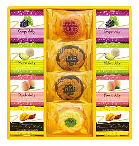 - 原材料:ロシアケーキ(リッチビター)・プレミアムマンゴープリン(約52g)・ゼリー(メロン・グレープ・ピーチ)(約52g)x各2個、ロシアケーキ(マカロンストロベリー・フラワーキウイ)x各1個