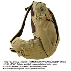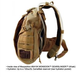 -. Feature : Main compartment: 18" (High) Tapers from 16" wide at base to 6" wide at top. / Total Capacity : Over 1600 cu. in. / Hydration (two) : Up to a 100oz/3L CamelBak reservoir (rear hydration pocket), 32oz/1L Nalgene (side pouch) (sold separately) / Shoulder Support : Wide shoulder strap (tapers from 4.5" to 3") / Waist Support : Concealable 1.5" waist strap