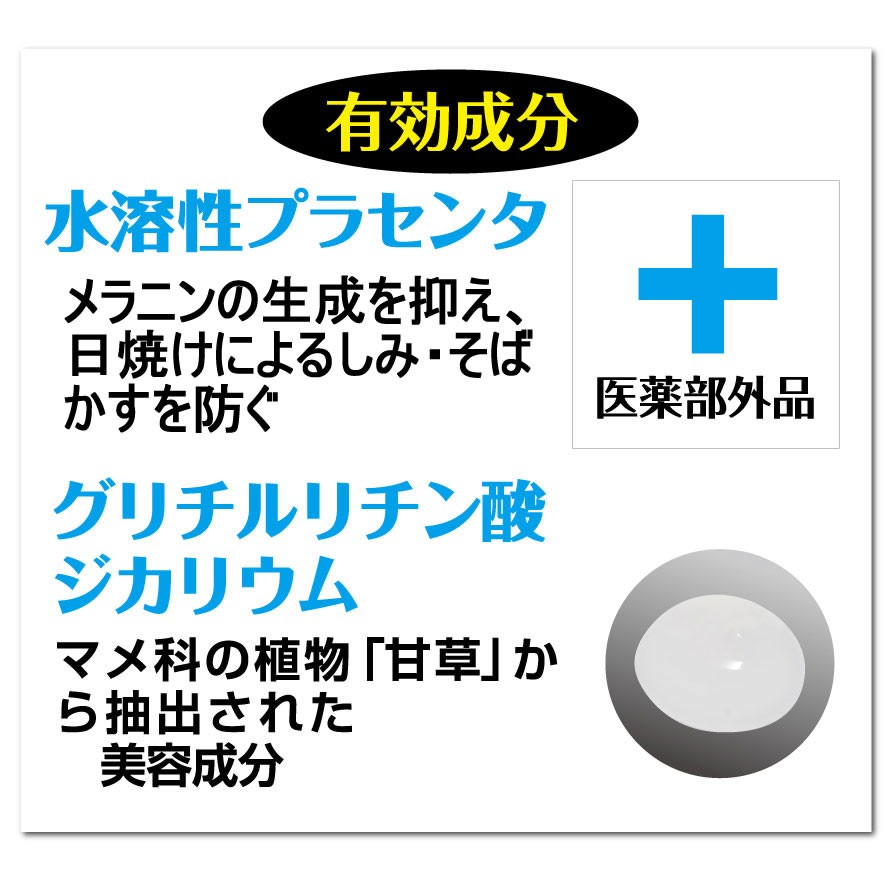 | 原材料 | 水溶性プラセンタエキス、グリチルリチン酸2K、アクリル酸・メタクリル酸アルキル共重合体、濃グリセリン、米デンプン、 混合植物抽出液-34、シルバーバイン果実エキス、カモミラエキス-1、酵母多糖体末、アーティチョークエキス、マロニエエキス、ヒアルロン酸Na-2、 塩化トリPOE(5)ステアリルアンモニウム、BG、フェノキシエタノール、香料 |