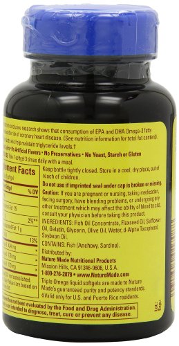 Product DescriptionThe Triple Omega contains Fish, Flaxseed and Safflower and Olive Oils. May reduce coronary heart disease.0