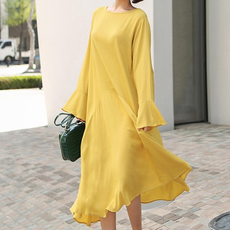 아치형으로 들어간 플레어 라인과 나팔라인의 소매가 어우러져 과하지 않은 여성스러움이 묻어나 데이트룩 하객룩등 특별한날 부터 데일리까지 활용도 좋은 원피스랍니다