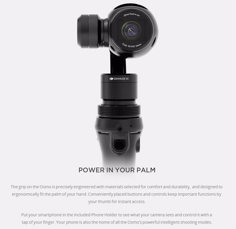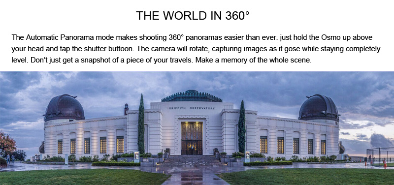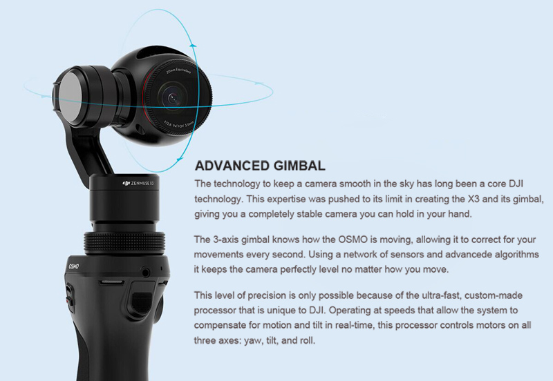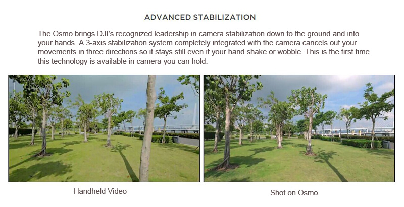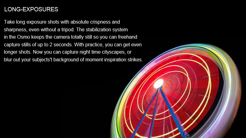 Motion without blur. Action shots without shake. Perfect video even when you move. Thanks to advanced technologies specifically designed to keep the camera flat no matter how you move it, the DJI Osmo helps you record videos and take photos like never before. It is much more than just a camera. It helps you create with more freedom than ever.