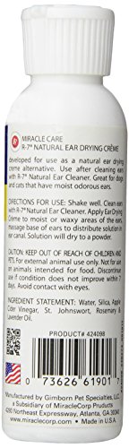 -. Binding : Misc. -. Brand : Miracle Care -. EAN : 0073626619017 -. Feature : Contains st John's wort and rosemary / contains no alcohol / Especially beneficial for long-eared breeds, swimmers or hunting dogs to prevent ear problems / Gently controls moisture and helps to prevent infection and irritation in your pet's ears / Helps to inhibit growth of parasites, bacteria and yeast / No cortisone or antibiotics, safe to use for dogs or cats -. Label : Rich Health -. Manufacturer : Rich Health -. Model : 424098 -. MPN : 424098 -. NumberOfItems : 1 -. PackageQuantity : 1 -. PartNumber : 424098 -. ProductGroup : Pet Products -. ProductTypeName : PET_SUPPLIES -. Publisher : Rich Health -. Size : 4 Ounces -. SKU : BB-003-DRH61901 -. Studio : Rich Health -. Title : Miracle Care by Miraclecorp/Gimborn R-7 Natural Drying Ear Creme, 4-Ounce -. UPC : 073626619017