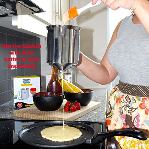 3 ITEM BUNDLE: Includes one (1) stainless steel batter dispenser, twelve (12) silicone baking cups and one (1) small, heat resistant silicone spatula. Perfect for pancakes, crepes & more!