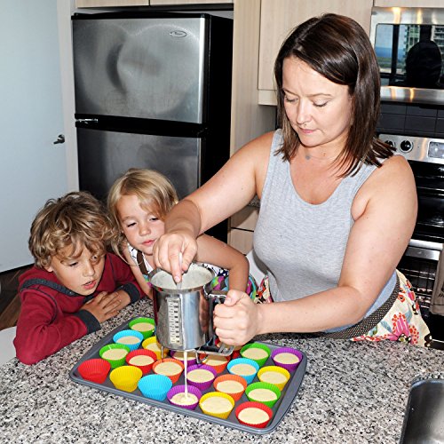 SPATULA HELPS YOU MOVE THE BATTER AND SILICONE CUPS CAN BE USED AGAIN & AGAIN: This small but sturdy utensil can be used to pour the batter from the bowl to the dispenser and move thick batter (like donut batter) faster. You also get 12 nonstick BPA free silicone baking / cupcake molds in 6 vibrant colors. Great for cupcakes & more. No more need to buy disposable cups.