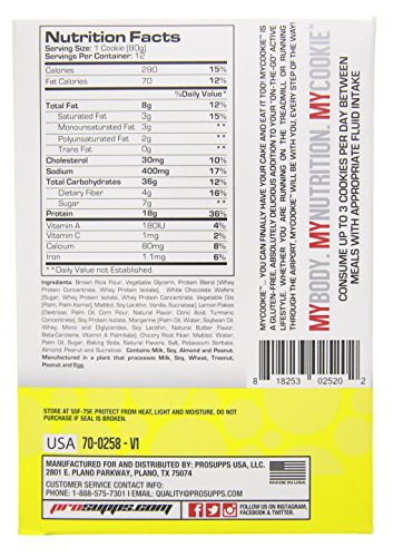 ReleaseDate : 2017-06-22 Studio : Pro Supps Publisher : Pro Supps Binding : Health and Beauty Product Description MYCOOKIE. you can FINALLY have your cake and eat it too! MYCOOKIE is a gluten free, delicious addition to your "on-the-go" active lifestyle. Whether you're lifting weights, running on a treadmill or running through the airport, MYCOOKIE will be with you, every step of the way! MYCOOKIE protein cookies are perfect for a post workout or in between meals protein boost when you're on the run. Build muscle faster by taking one 30 minutes after every workout. Each cookie provides the perfect balance of protein (18g) and only 7g of sugar to boost protein synthesis. That means more protein is being absorbed so you get faster muscle gains. Each cookie is designed for the athlete in mind but they also taste great. They're not chalky like your average protein cookie and come in six delicious flavors; Chocolate Chip, Peanut Butter, Snickerdoodle, White Chip Chocolate, Red Velvet Cake and Iced Lemon Pound Cake. The MYCOOKIE protein cookie is easy to pack in your gym bag so you can take a few with you wherever you go. When you're done training, you've got an instant snack ready to go. They're a perfect fit to your existing diet as well. They clock in at a mere 290 calories so you won't break your diet by having one! 0