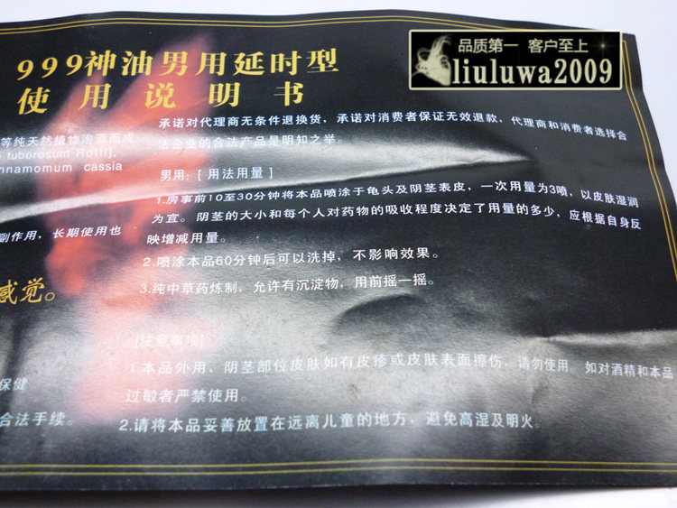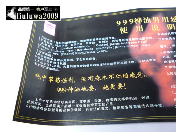 Dosage 999 male god oil for 10-30 minutes delayed-type room in advance of this product will be sprayed on the glans and penile skin, the amount of moisture in the skin is appropriate. Spray the product can be washed off after 60 minutes without affecting the results.
