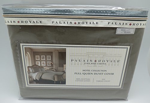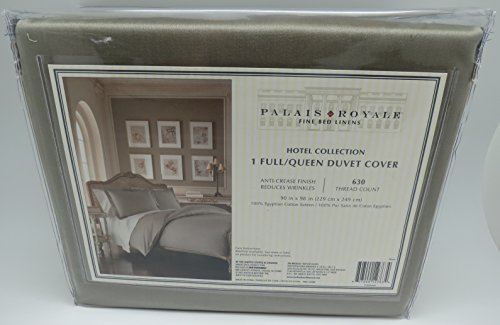 Product Description This listing is for a Palais Royale full queen size duvet cover in a stone color. The dimensions are 90 inches x 98 inches. The fabric is 100% Egyptian Cotton Sateen, 630 thread count, machine washable and even features an anti-crease finish to reduce wrinkles. 0