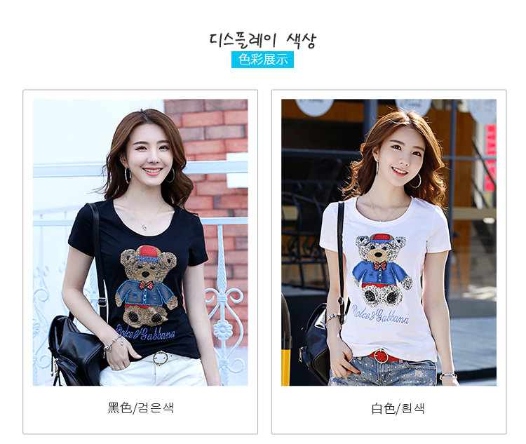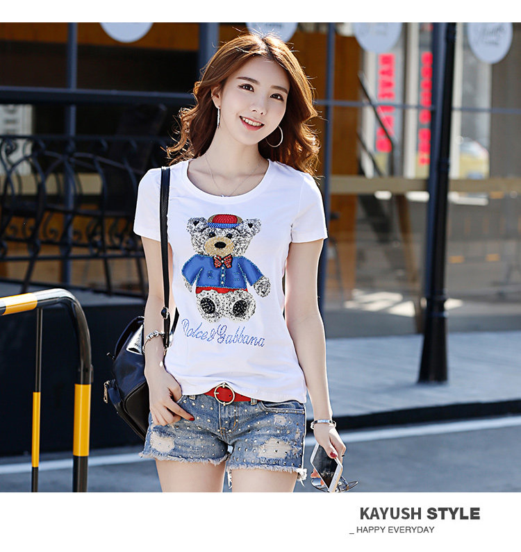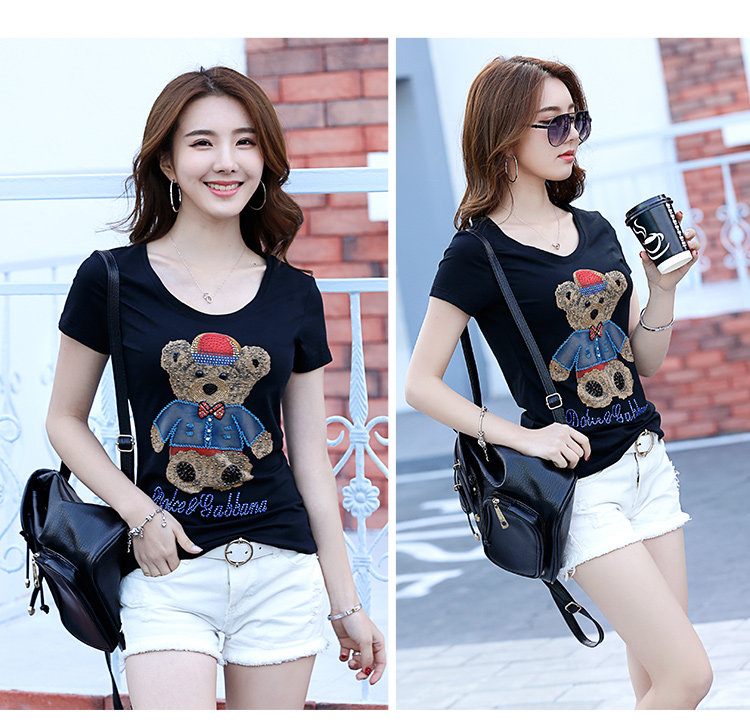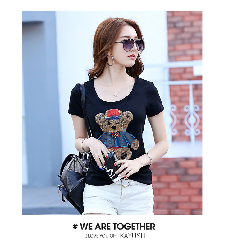 新颖哥弟特夏短袖t恤女修身小熊印花钉珠烫钻半袖纯棉体恤打底衫