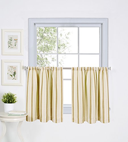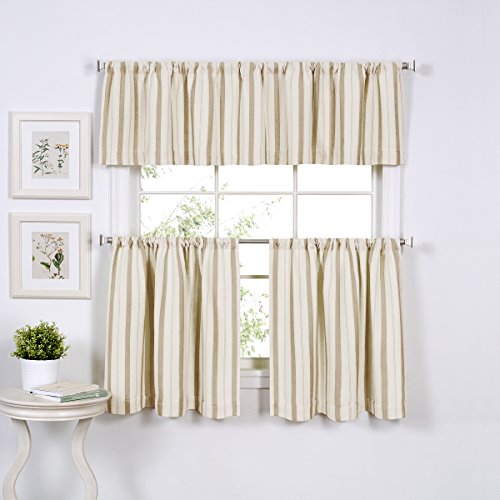 Studio : Elrene Home Fashions Publisher : Elrene Home Fashions Binding : Kitchen Product Description Rod pocket stripe window kitchen curtain Cafe tier set is a classic sun washed ticking stripe design invites color and a touch of vintage sophistication in any space. No, we did not sew this incorrectly. The styling has a beautiful look where the front will appear more muted than the back. This unique design element is intentionally crafted to accentuate the vintage design. Rod pocket styling fits up to 1.5 in. Rods. Antiqued ticking stripe design. Easy-care fabric. 100percent cotton. Machine washable. Tier sold in set of 2. Valance also available sold separately. 0