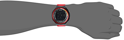 Metallic black resin case with red metalized top ring; reverse LCD display with time, seconds, day and date; red resin strap with buckle closure