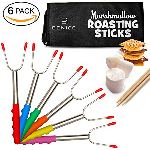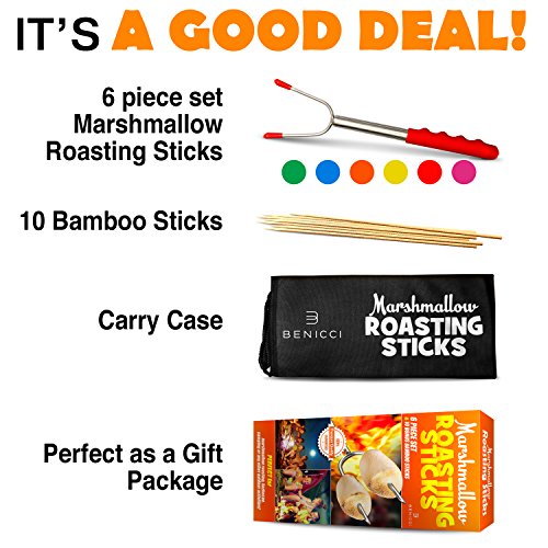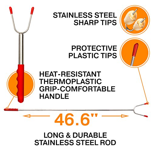 ? THE LONGEST LENGTH YOU'VE SEEN: 46.4" telescoping handle! ? 6 PIECE SET: Each with bright individually colored handles - green, pink, yellow, blue, orange and red. Saves cross contamination (and hotdog thieves!) ? FDA APPROVED, FOOD GRADE: Stainless steel campfire roasting fork ? EASY TO CLEAN: Including burnt Marshmallow! ? RETRACTABLE: To a compact 11" for easy storage ? **FREE BONUS #1: Carry bag for storage and transport ? **FREE BONUS #2: Set of 10 free bamboo skewers for shish kabobs ? **FREE BONUS #3: 65 Ways Of S'mores From Traditional To Crazy - E-Book ? 30 DAY GUARANTEE: Refund or replace - no questions asked